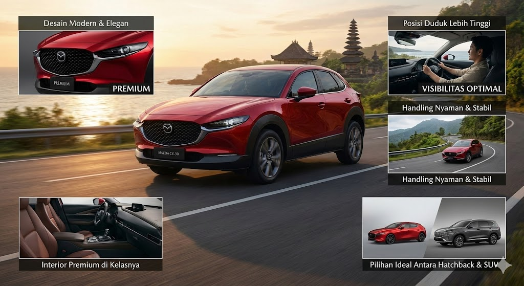 Mazda CX-30 hadir sebagai crossover modern yang mengisi celah antara SUV kompak dan hatchback premium. Mobil ini semakin banyak dilirik di Indonesia karena menawarkan desain elegan, kenyamanan tinggi, serta posisi berkendara yang lebih tinggi dibanding Mazda 3, namun tetap terasa lincah dan nyaman untuk penggunaan harian.